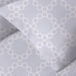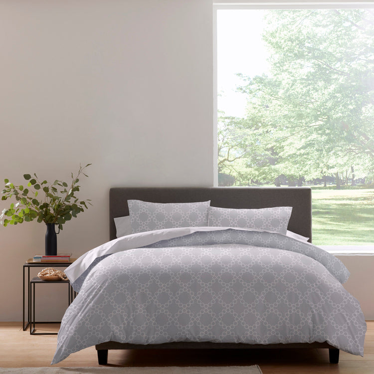 Our Clean Design Home® Palais Duvet Set has three items with a duvet cover and matching shams. This duvet cover set is a simple solution for refreshing your space. The pattern features an interlocking circle design which evokes classic sophistication. Made of 100% cotton in a smooth sateen weave in a 400 thread count. Patented weave is specifically designed to reduce allergen triggers.
