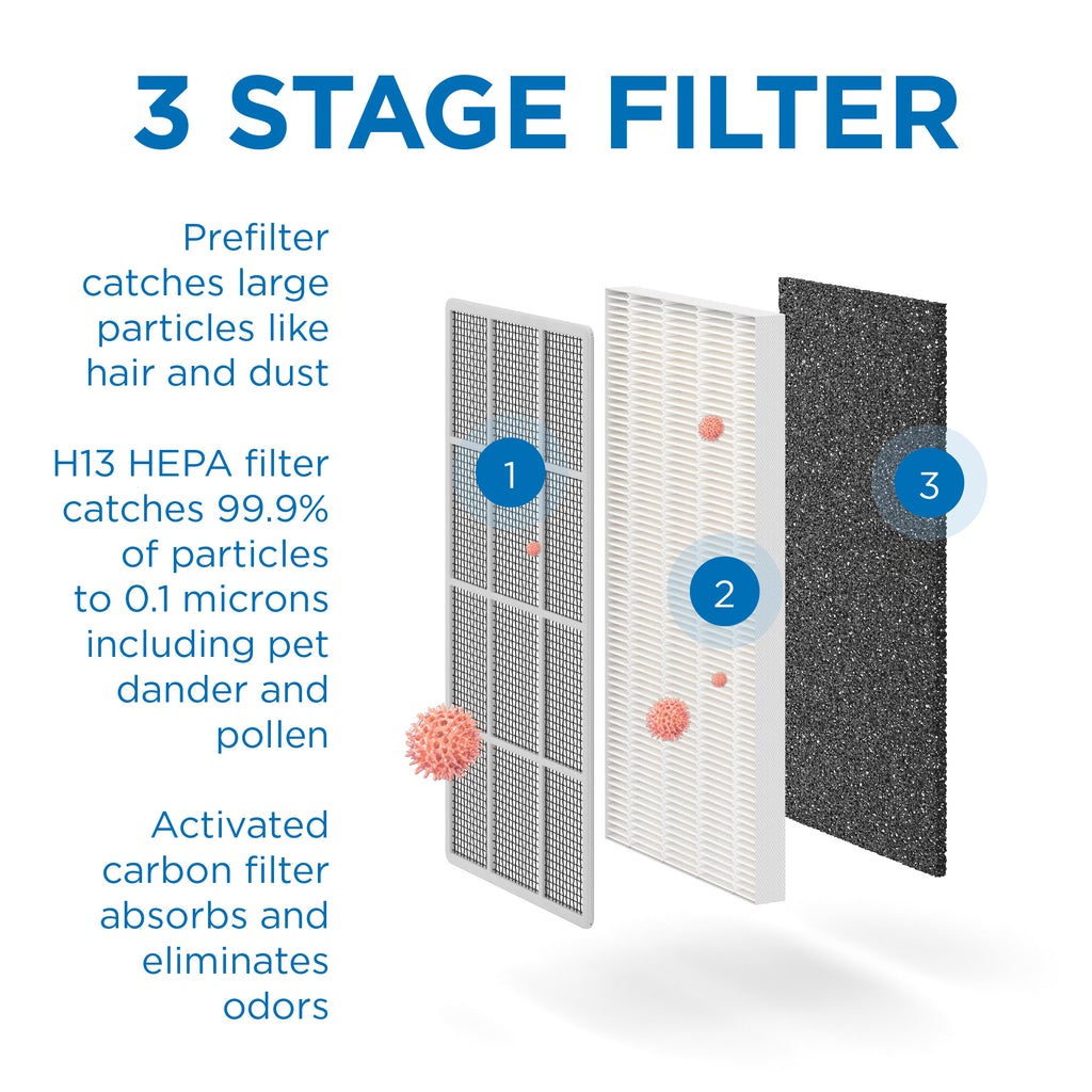 H13 HEPA filter captures 99.99% of all particles down to 0.1 microns in size.