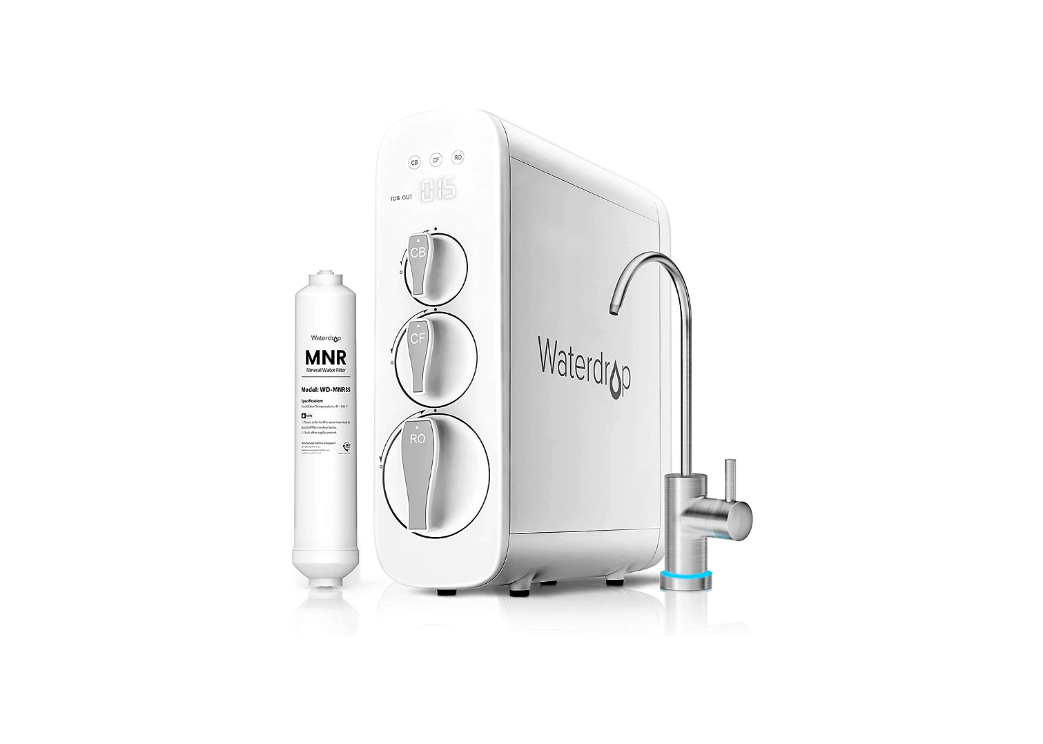 The Waterdrop 400 GPD Reverse Osmosis system delivers 400 gallons of water per day, has a smart designer Faucette, TDS display, automatic flushing, audio reminder, do-it-yourself installation, and tankless design.