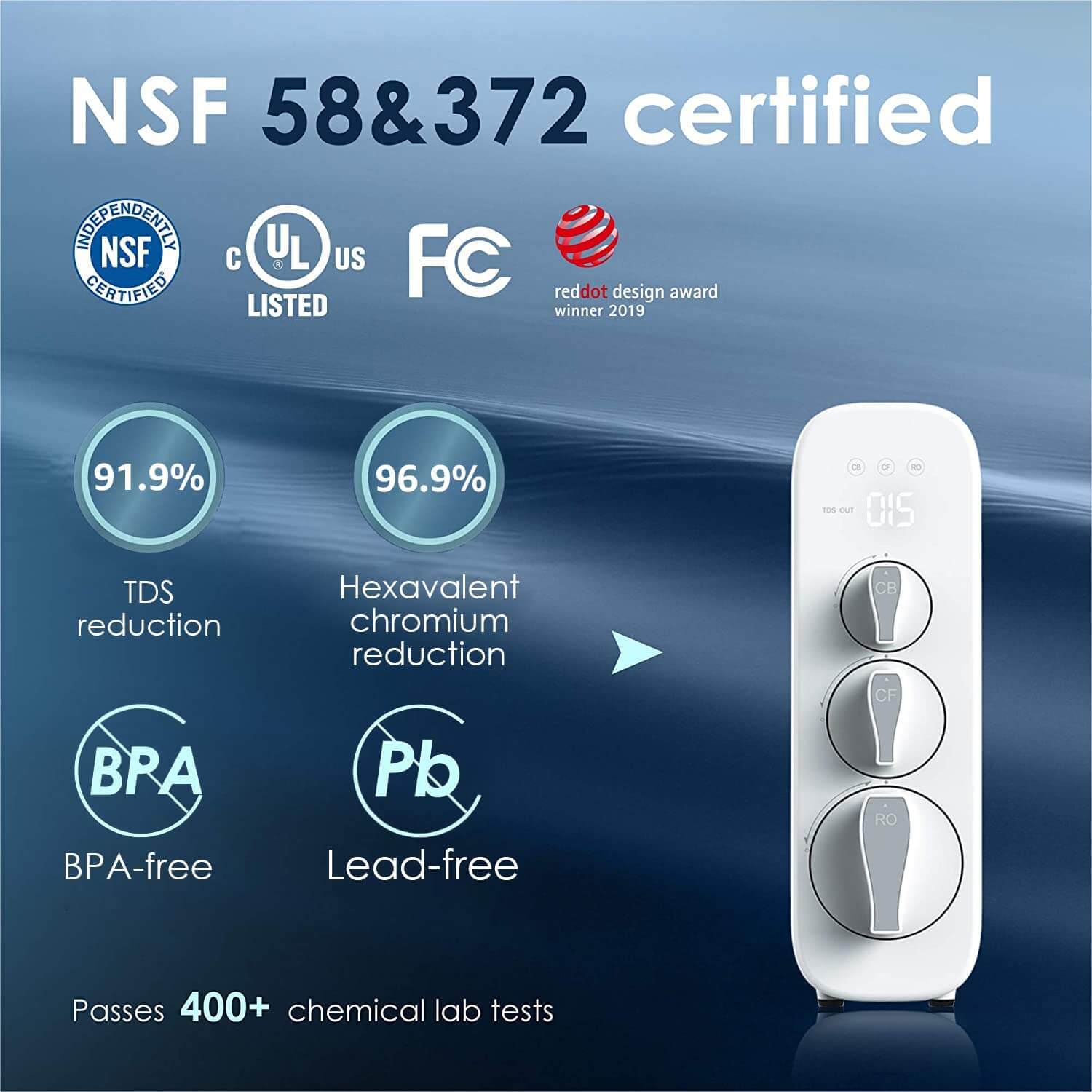 Waterdrop reverse osmosis water filter system is tested and certified against NSF/ANSI standard 58, the TDS reduction rate is up to 91.9%.